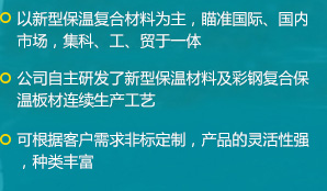 公司是一家瞄準國際、國內市場,集科、工、貿于一體的綜合性公司,擁有各類先進的設備100余臺(套),公司自主研發了新型保溫材料及彩鋼復合保溫板材連續生產工藝,建成了機上一次成型彩鋼復合保溫板材的生產線...